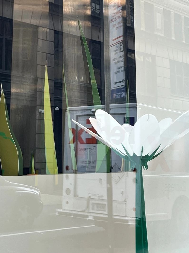 Amazon commissioned an installation for their new corporate headquarters at the renovated Lord and Taylor building in Manhattan. The work, called "Dream Terrarium" in Latin, activated the windows with giant paper and acrylic plant life and large paper collages depicting flying abstract forms in vibrant, spring like colors. I think of it as a Dream of Flowers, projecting their beauty into the wall and spaces surrounding them.