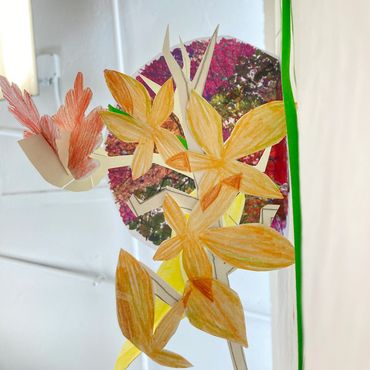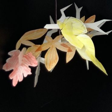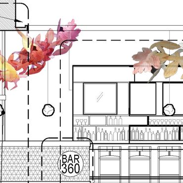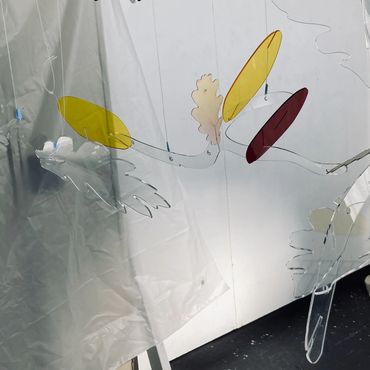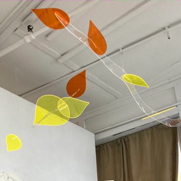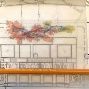 Organic Chemistry (Falling Leaves), is a hanging ceiling piece designed to interact with a digitally printed mural above the central bar at Resorts World Casino, in Newburgh, NY. The circular area has a 40 foot diameter. Each of 4 clusters water-jet cut leaves and branches span approximately 5 x 6 x 14 feet at each entrance to the bar. The project represents trees that are native to the Catskill Mountain area.